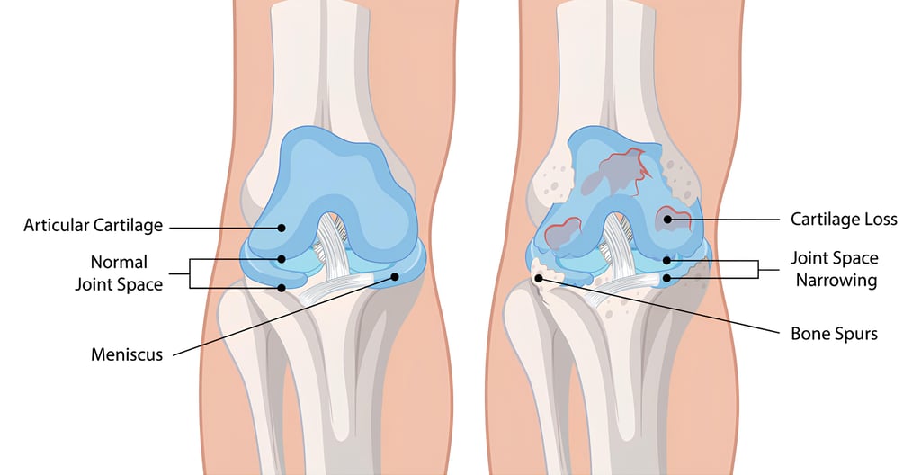 Kıkırdak Kaybı: Eklem kıkırdağında ilerleyici yıpranma ve kayıp başlayıp, eklem aralığının daralması